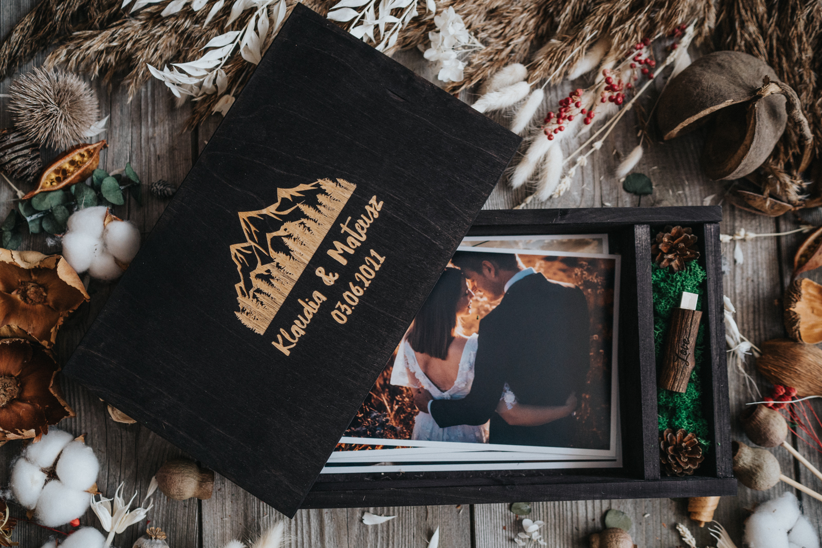 Pudełko jest wykonane z drewna sosnowego z przedziałem na pendrive i odbitki. Przedział na pendrive wypełniony jest mchem i szyszkami. Do zestawu dołączony jest także, jutowy sznurek do związania odbitek.